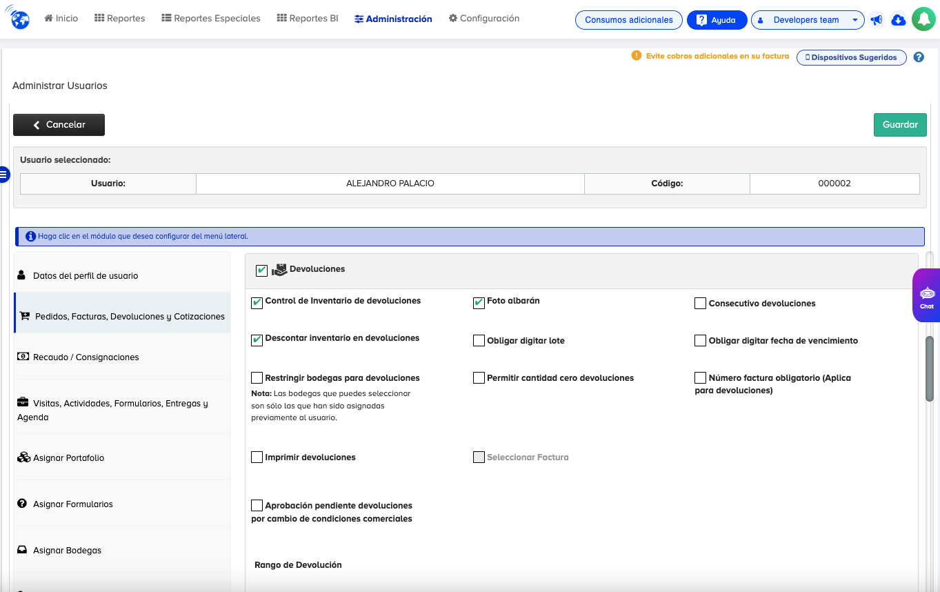 Hemos implementado una mejora en la Administración de Usuarios de la plataforma Web, enfocada en la reorganización de permisos y notificaciones para facilitar su configuración y uso.